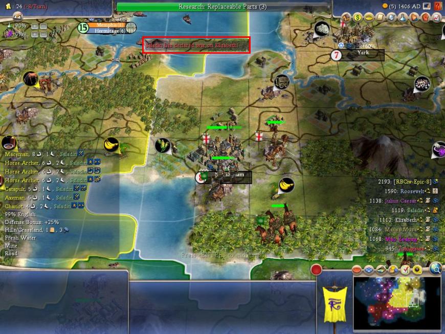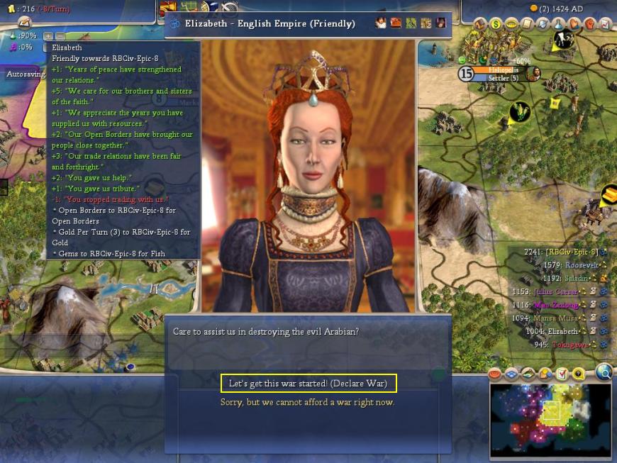 My Democracy slingshot had me in good shape, but I landed an even larger break of luck a couple of turns later when Saladin decided to get frisky and declare war on Elizabeth: