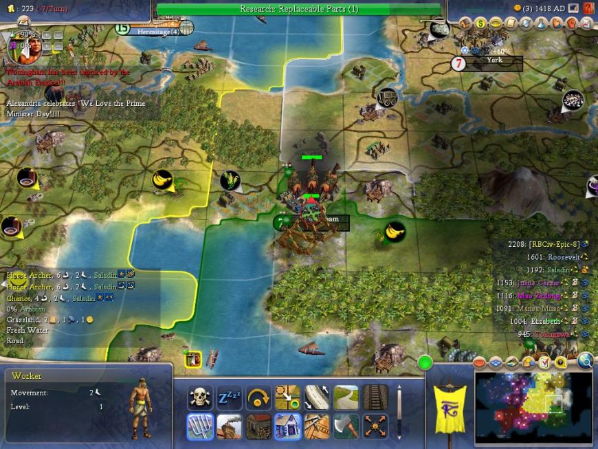 Once it became clear that Saladin was not going to invade me from the east (he had plenty on his hands, between his wars with Liz and Caesar), I founded an aggressive city three tiles west of Nottingham. With a chopped theatre and forced Artist specialist, I would be able to expand my borders VERY quickly there as well. The military struggle bonus pushed Caesar over the top to "Friendly" status in 1466, woohoo! - and then he converted to Taoism in 1478. D'oh! I would just have to try and convince him to switch back down the road, possibly by feeding him a tech or two.