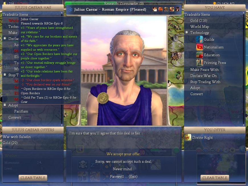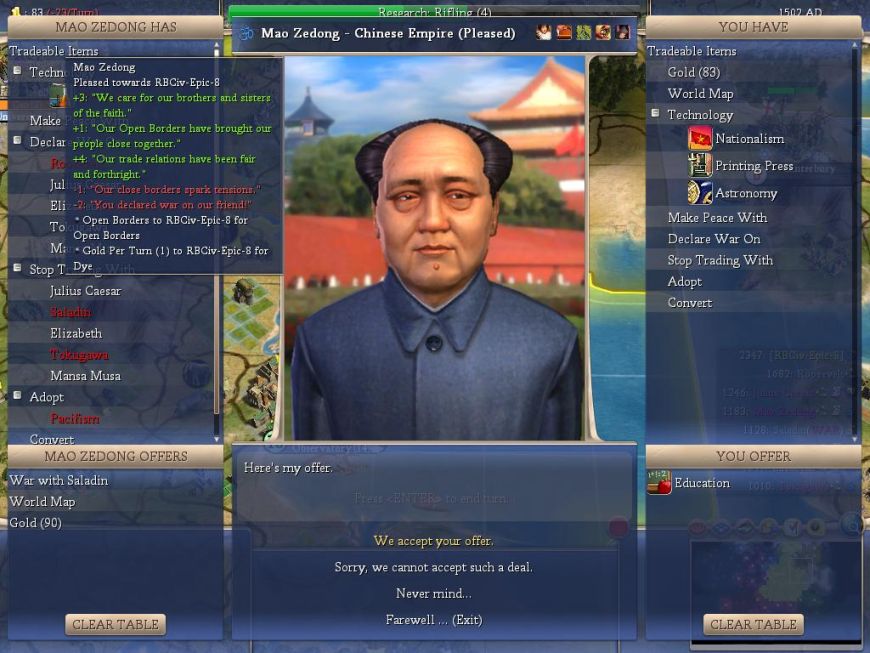 OK, the problem here is that SOME of my friends hate Saladin (Liz) and SOME of them like Saladin (such as Caesar). I can't let that state of affairs go on! Everybody's going to have to be on the same page here. So I decided to trade away some of my outdated techs in order to rectify the situation: