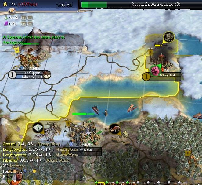 A lousy city, but I'll still take it! Awdaghost has been sitting on 0% Malinese culture ever since 1286AD (umm, that was over 25 turns ago...) but this was the first revolt. Now all I can do is cross my fingers and hope I'll get another one for the flip. I've got about a 5% chance for a revolt each turn, it's just a pure dice roll at this point...