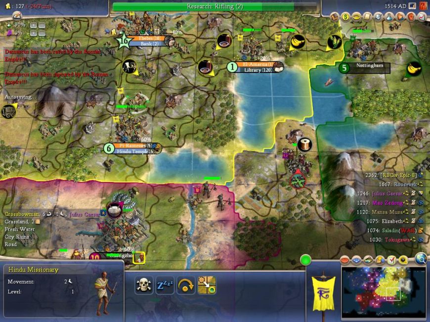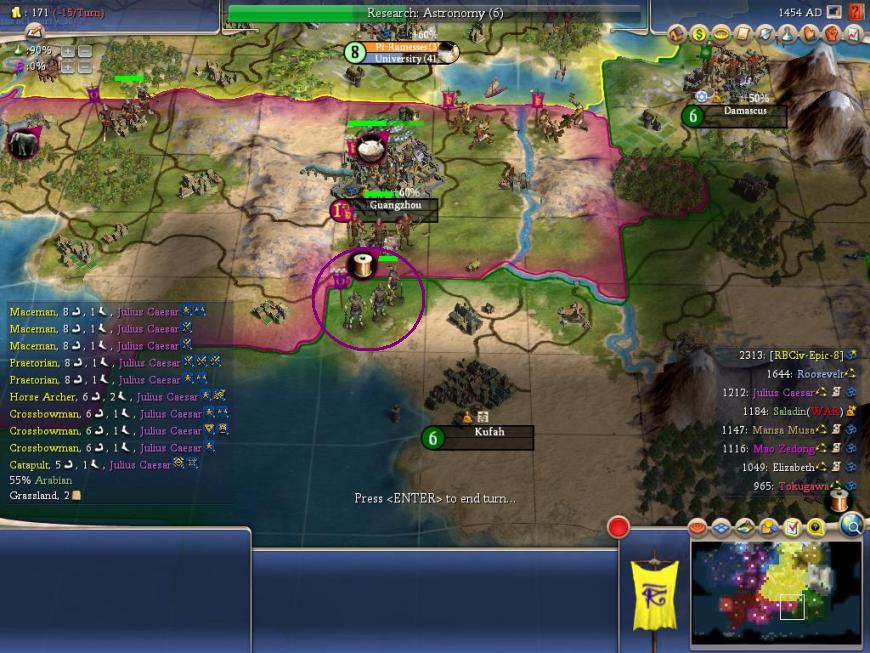 I might not have been fighting, but the war ground on in the south without me. Caesar's stack of doom was starting to peter out, but he still had force enough to capture and raze Damascus on my southern border:
