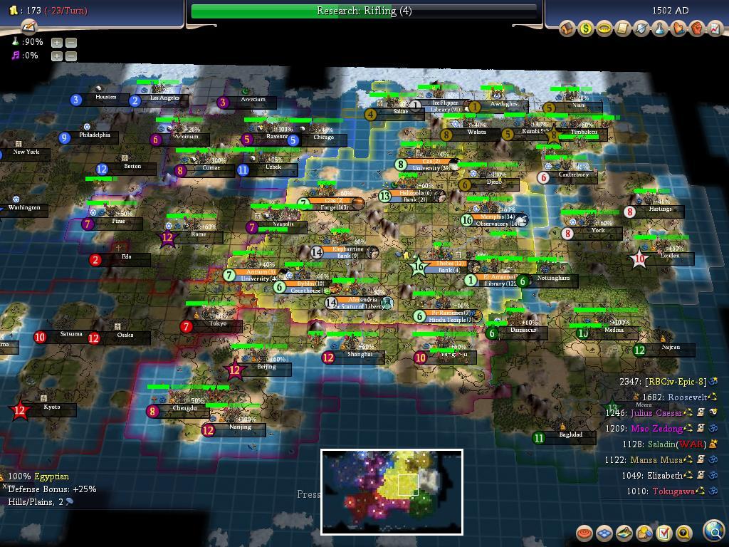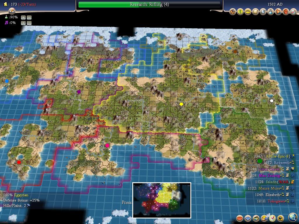 I marked the capitals with dots to illustrate the starting positions; my favorite thing about the bare map is the ease with which you can see the borders. Clearly, I did rather well for myself in terms of grabbing land, especially in the north and in the west. Antium was actually Rome's second city, and I got it to flip to me! Mansa has seven cities, but they are very weak, and he's been squeezed badly. Liz is in worse shape, with only four cities to her name. Poor girl. Saladin looks better at the moment, with six cities, but he's already had one razed, there's another one under severe cultural pressure, and Mao/Caesar are moving large stacks into his borders now. Mao and Toku both have six cities (five on land and one offshore for each of them), but were unable to expand out of the south. Caesar has seven cities and did well in the north, but has fared poorly everywhere else. And FDR - he carved up the north and did MUCH better than any of the other AIs. That, along with the Colossus/Great Lighthouse/Pyramids combo separated him from the pack of the other civs.