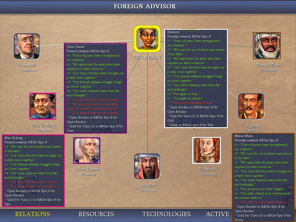 As I said, I was of course going to accept the offer and start adding military struggle bonuses with the English. What I was NOT expecting was the minuses that I got from Caesar and Mao when I agreed to start the war! Say what?! Mao was at -2 overall relations with Saladin, and yet he STILL got angry at me for "declaring war on his friend"? Argh! Did I mention it's hard to make friends with more than a couple of civs in this game?