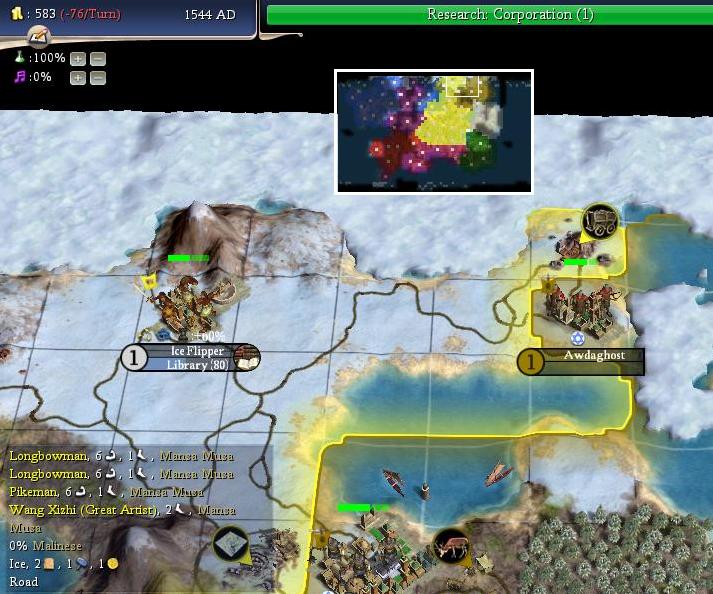 The Great Artist will end any chance of me flipping Awdaghost. So the net total for Awdaghost: it sat at 0% Malinese culture from 1286 to 1544, a total of 50 turns. I got one revolt in those turns, but could not get the flip. Guess the dice just didn't fall my way that time...