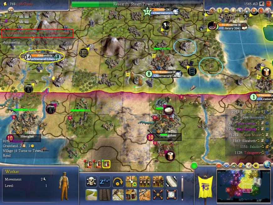 War between FDR and Caesar! Wow! Big news. Also look at the left side of the screenshot above: Statue of Liberty due in 1 turn. I would get that wonder as expected in 1568. These two events were so important, they initiated a new chapter in the history of the Egyptians...