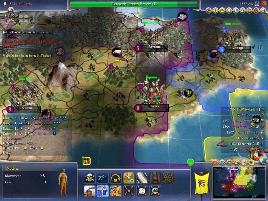 Uzbek was the barb city that I first came across back in the extremely early game. I was glad to see it pass into Roman hands, except for one thing: Caesar added another Taoist city to his empire, and that must have tipped him over the line into declaring a new state religion (check the announcement on the left side of the screen). Ack! With FDR declaring war on the Romans (a big, fat -3 to their relations) it was unlikely that Caesar would vote for my opponent, but I still had better do everything I could to get that religious symbol turned back to the Hindu one!