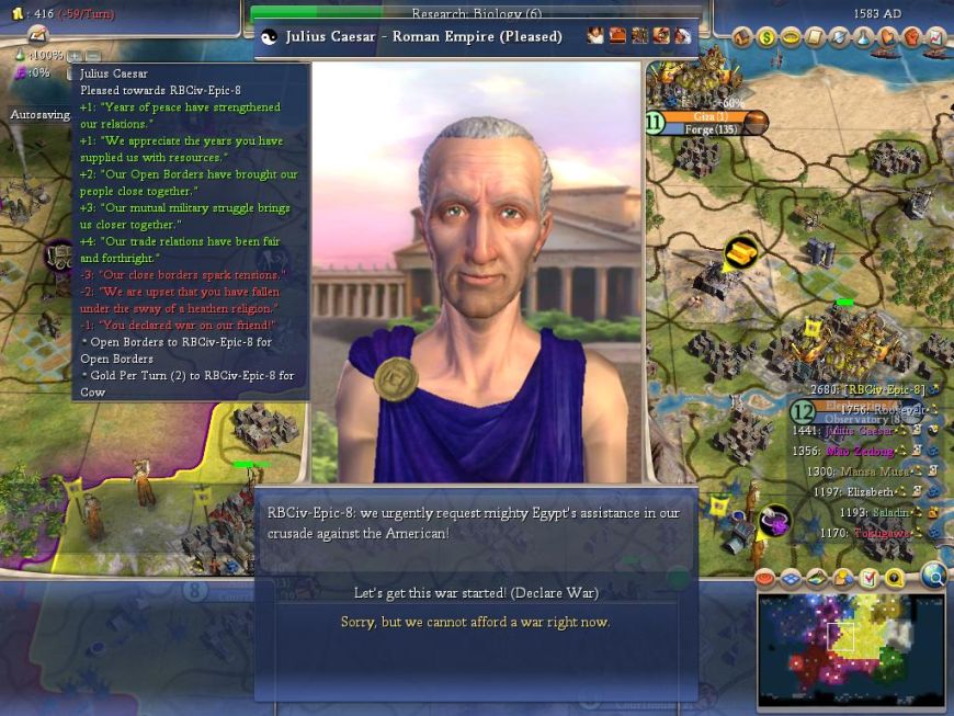 When FDR declared war on Caesar in 1565AD, I literally said the word "YES!" out loud. (Probably a good thing I'm living in a solo apartment right now. ) This was the break I needed; declaring war on America myself without just cause would only make some of my allies upset, but taking up the side of the right and true in a Roman/American war... ah, now THAT had possibilities! I knew that I could use this as a wedge to separate the Hindu civs from FDR; if I could just get them all to declare on the Americans, then that would poison their relationship and ensure that they would never vote for him!