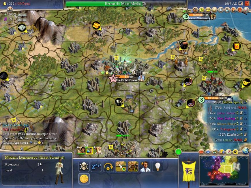 I discover Radio in 1661 and enter the Modern Age, beginning research on Mass Media for the UN. Two turns later, Thebes produces a Great Scientist and I use him to trigger a golden age to speed along the last tech!