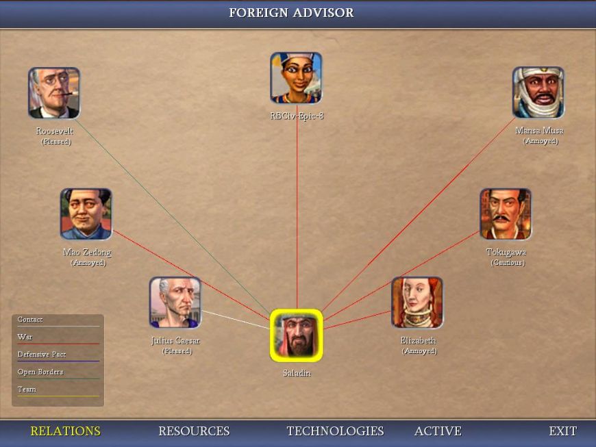 Liz asked me to declare war on Saladin a couple turns later in 1646, and I once again agreed to do so. Since all of my Hindu friends disliked Saladin by now, I did not pick up any relations minuses for doing so. If I was going to be embroiled in a second war, I figured I might as well get the rest of my allies on the same page as me, so I paid Mansa a tech to join in the war. Mao had just signed peace with FDR, so I got him to jump in too for another tech. The important thing is to keep that shared military struggle running strong with everyone in the game (except FDR and Saladin, naturally).