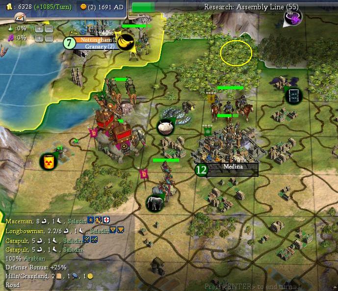 I've already identified my next location for an aggressive city, on the yellow circle, and I have a settler ready to go. (Of course, if the AIs choose to raze rather than capture, I'll have to hurry more than one settler down here to grab all the new land!) By 1697, Saladin had nothing but CATAPULTS left defending in Medina. And yet... the AIs inexplicably failed to capture the city. Mansa decided to pillage with his cavs rather than capture the darned civ. Argh! Stupid AI! *sigh* Having to work through these AIs instead of doing the fighting yourself sure is tiresome. It's rather like running a minion army with a necromancer from Diablo 2. You have only the feeblest control over these AI entities, and I didn't even have any curse support to help out. If only I had a little "Lower Resist" to use on the AI cities, or maybe some "Dim Vision" to cast on the Arabian defenders.