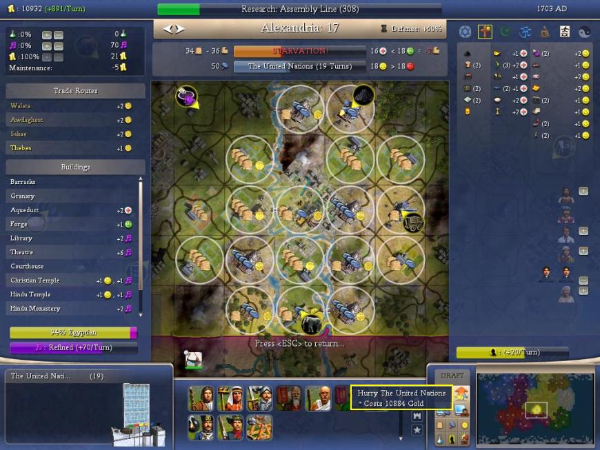 Anyway, if you look closely at that last screenshot, you'll see that I have over 6000 gold in the bank and am running 0% science to accumulate more money. That's right, since I lack Assembly Line and have no factories, the fastest way to build the UN is to use what I'll always think of as the "Speaker UN rush" via Universal Suffrage. Well, after nine turns of cash accumulation I have enough money to get it done in 1703: