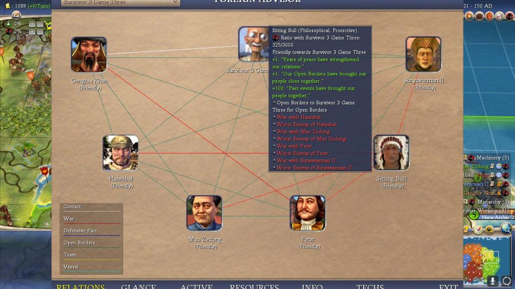Game Three featured a more aggressive collection of AI leaders than our previous match. Nearly all of these leaders had low peace weights and a preference for engaging in war, with Genghis Khan Temujin leading the pack. The Mongol leader generally does nothing but build units and research military techs, making him a destructive wildcard in these games. The heavy favorite from the community was Mao Zedong, due to a combination of his excellent performance in past years and the large amount of open space near his starting position. Suryavarman was the other leader in this game with a past history of success, however his more cramped location and proximity to Temujin's insanity made him a less attractive choice. Hannibal and Peter both had good positions in this game, and the biggest thing holding them back was their history of failure in past years. Hannibal in particular had let me down twice in the first two years of the competition, and I didn't want to get fooled into picking him again. Finally, the one leader who seemed to have no chance to win was Sitting Bull. We've derisively referred to him as "Sitting Duck" in the past, as his AI personality seems determined to make a nuisance of himself without doing much to win. Sitting Bull makes tons of demands of other leaders and loves to poison enemy cities with spies. This causes everyone to hate him, and with his poor leader traits he doesn't have much to fall back on. Even worse, his high peace weight made him a pariah in this game where all of the other leaders had low peace weight scores. Almost 60% of the predictions had Sitting Bull as first to die, one of the highest margins we've ever seen. The community was gunning for him and rooting for his failure.