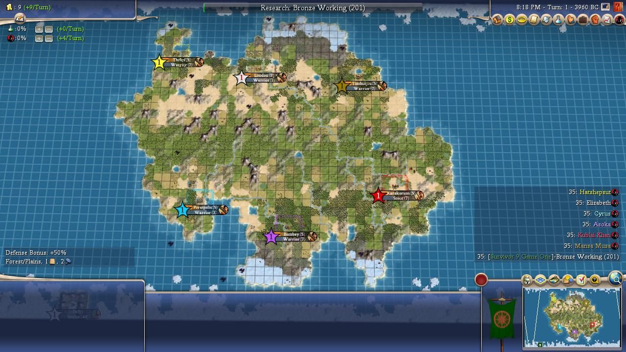 Past Performance: Cyrus's AI Survivor career got off to a promising start, as he followed up a Season One playoff appearance with a breakout Season Two, outputting three strong games and falling just seven turns short of being the champion! Since then, he's had a much rougher go at it, failing to make it out of the Opening Round in four of the past six seasons. He rediscovered some of his spark in Season Six, his best season in years where he returned to the Championship off a pair of second place finishes, but he finished the final game in a distant third. Most recently, he bungled what should have been an easy Season Eight opening round victory with a poorly thought out Immortal rush of Julius Caesar and then was a complete no-show in his Wildcard Game. His struggles have shone a light on two significant flaws: 1) he's a warmonger with not particularly great economic tools who cannot plot at Pleased, and 2) he can plot with four-strength Immortals, which are terrible units to rush with in Survivor games. Don't be fooled by his rocky history or the solitary win, though - while he's had a tough time finding lasting success, Cyrus is almost always a major player in his games. No one will be surprised if he undergoes a renaissance.