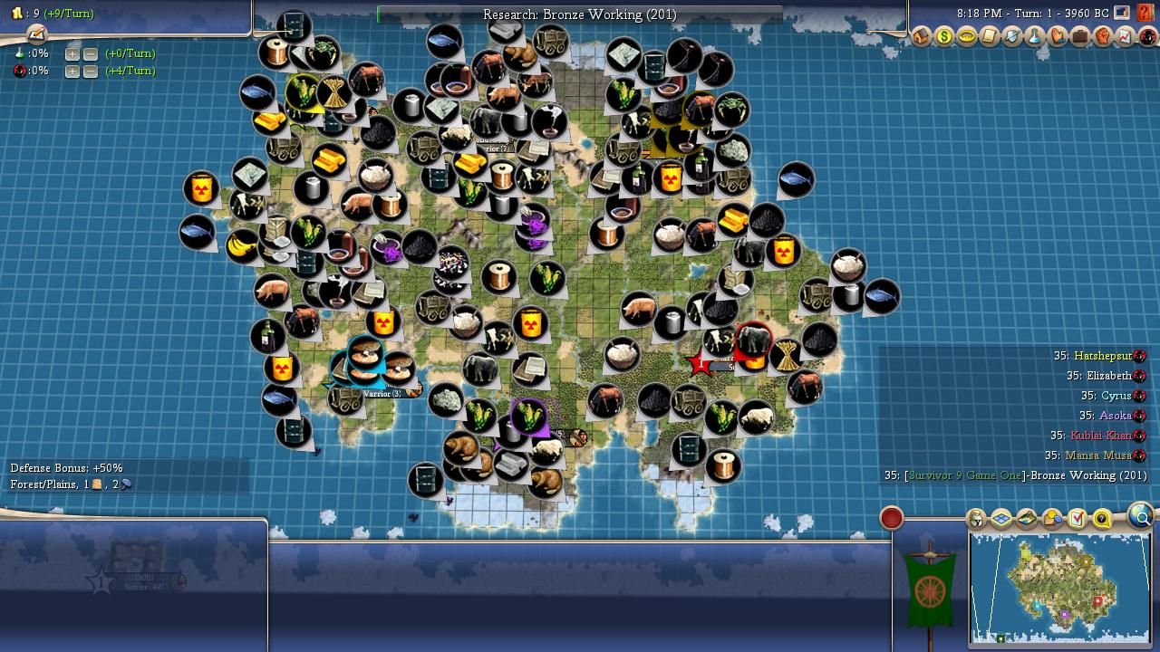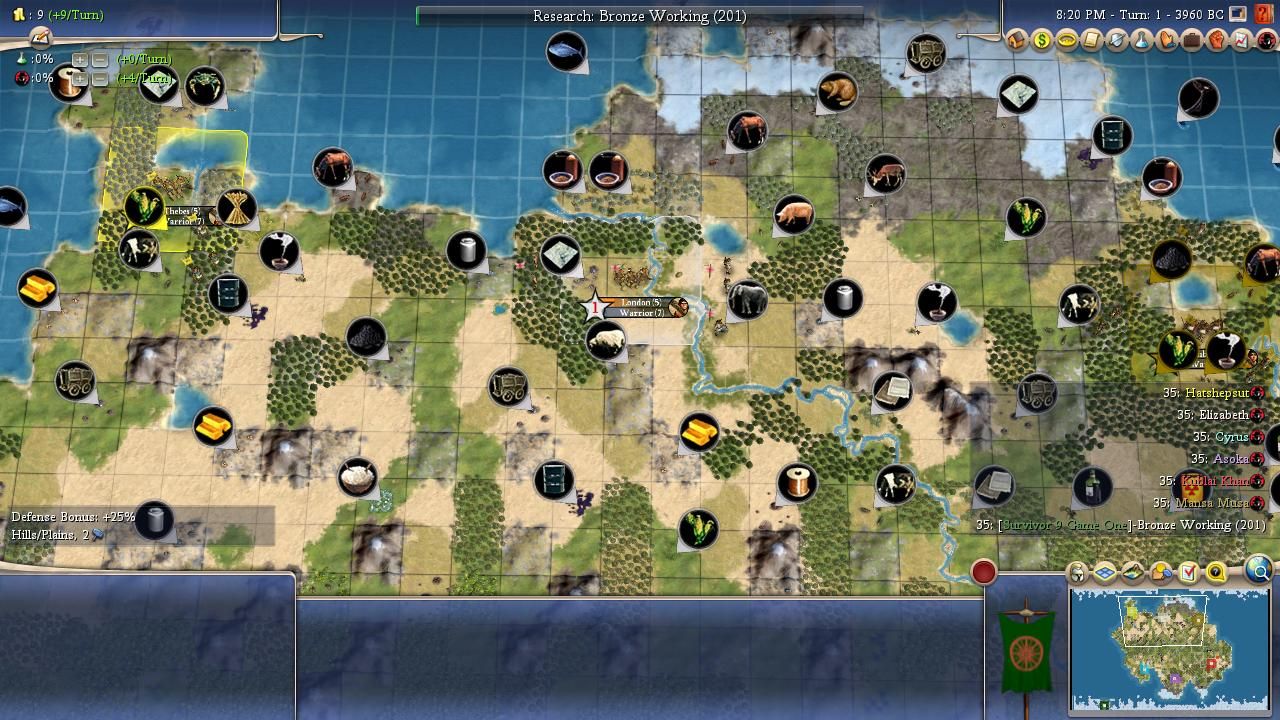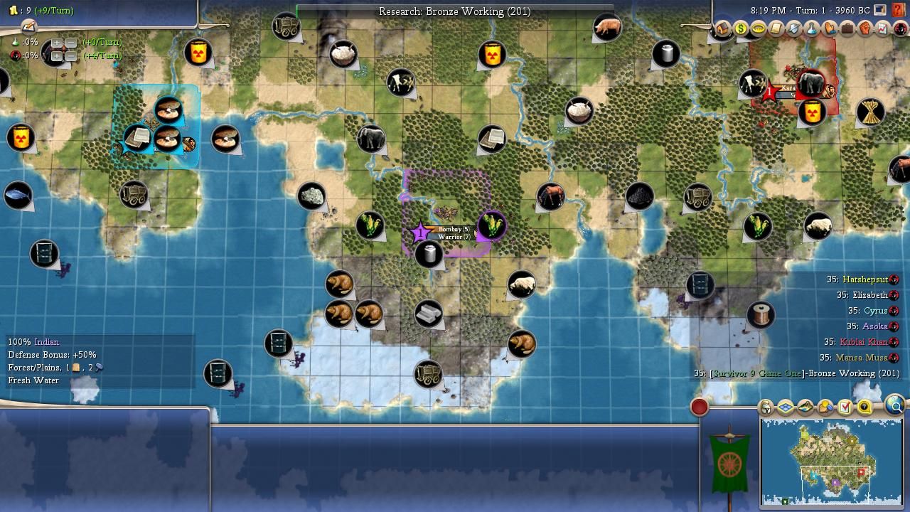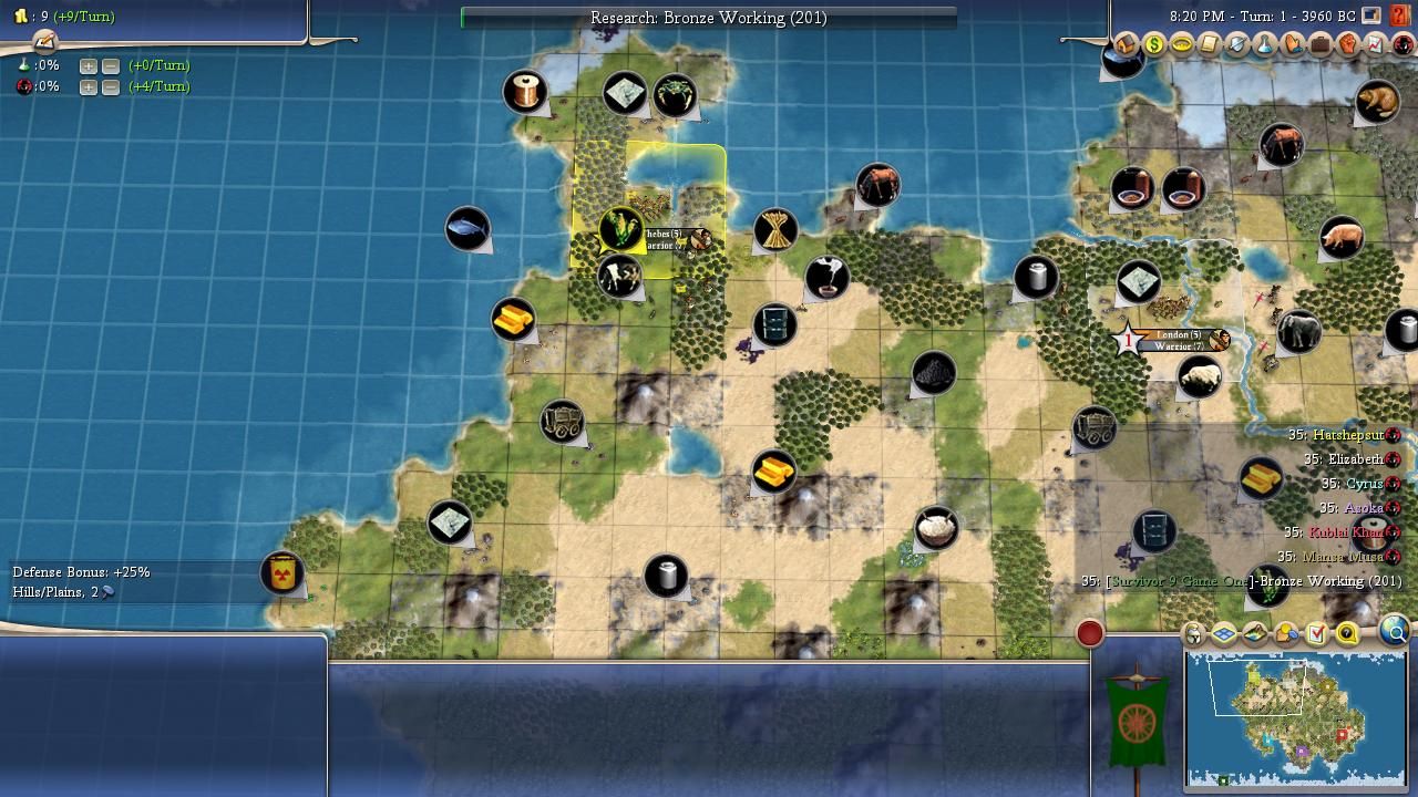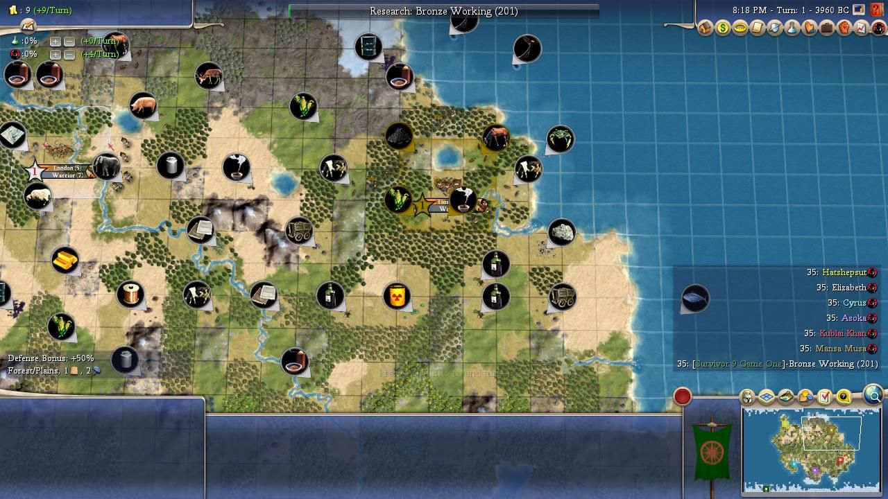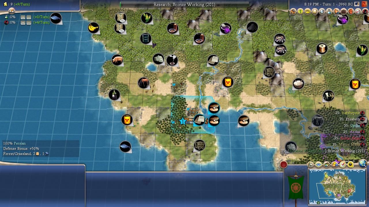 Personality: Cyrus has Charismatic and Imperialistic for his traits, a high synergy combination both for warfare and expansion. While he has very good starting techs with Agriculture and Hunting to help him quickly improve basically any food resource he has, his uniques are bottom-tier for AI Survivor due to Immortals; while most AI cannot plot war until they unlock metal units, the Persian leaders can plan disastrously early wars with just strength four Immortals. This is due to the AI needing at least two unit flags to plot: while regular Chariots only have the "mounted" flag, Immortals have both "mounted" and "anti-archer", giving their wielder enough to be coded to plot wars. This is especially a trap for Cyrus as he has a pretty high aggression rating (7/10) and builds a fair number of units (6/10). Interestingly enough, he loves wonders (8/10), cares an average amount about religion (big bonus for sharing, small malus for difference), and his flavours are Military and Growth. It creates the image of another one of the snowball leaders, and Cyrus' game plan seems to be building a lot of cities with Imperialistic, getting them tall with Charismatic and his Growth flavour, and then crushing a neighbour or two once he has an advantage in food and production (and hopefully stronger units than Immortals).