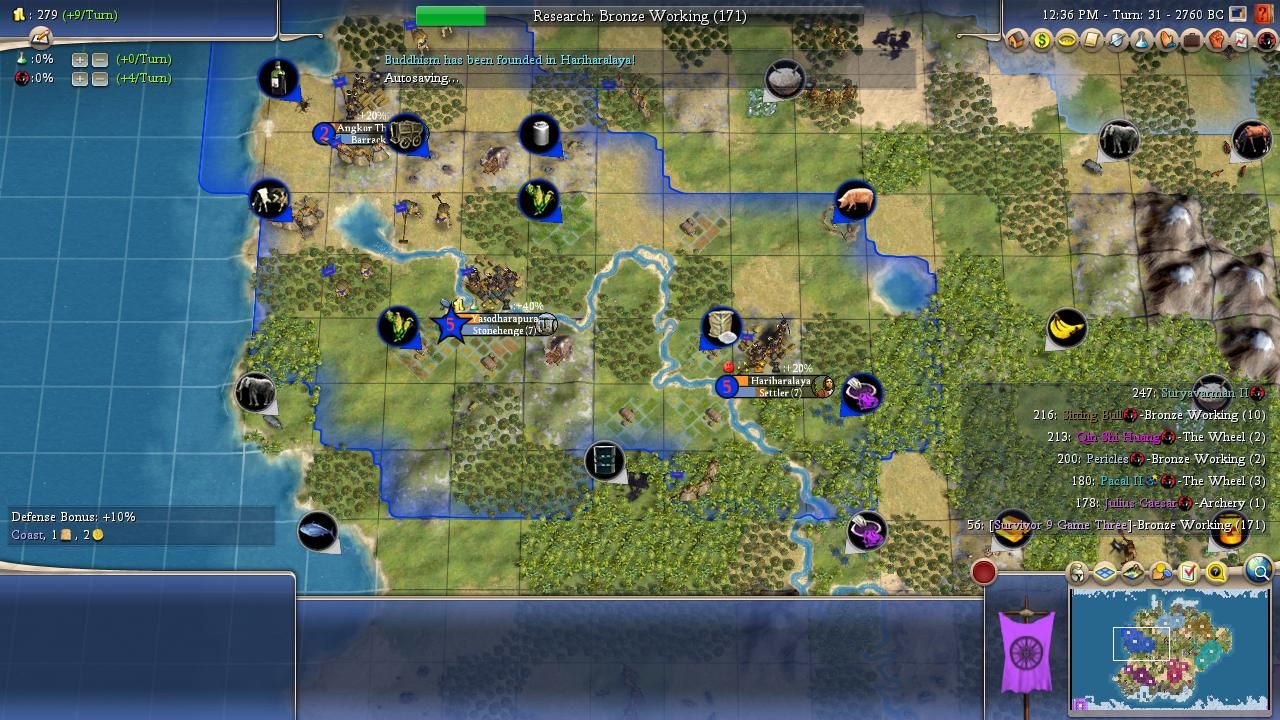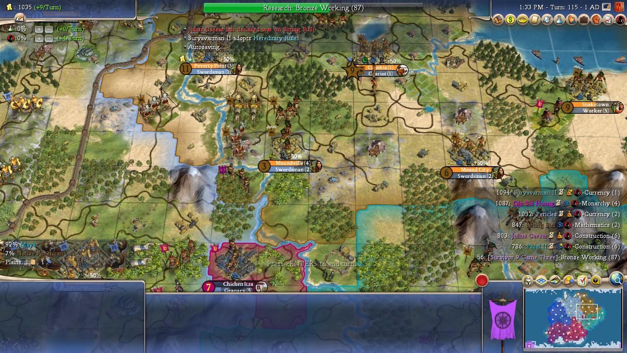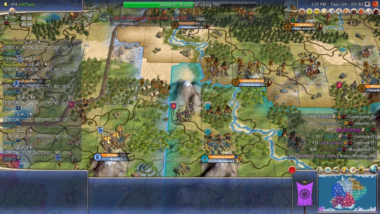 "There sure are a lot of angry Pacals amongst the fans now Bob. Speaking of seeded leaders in ruts, look at Sury, who only just settled his sixth city after being at five for so long. Those wonder builds and that one barb city has hurt him."