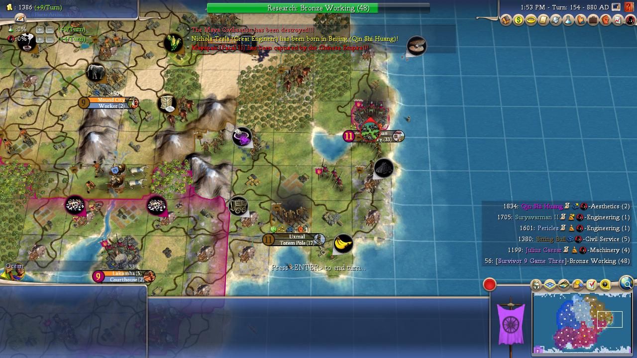 "And Qin will, deservedly, net the finishing blow on Pacal. It is official: the Mayans are First To Die, on Turn 154!"