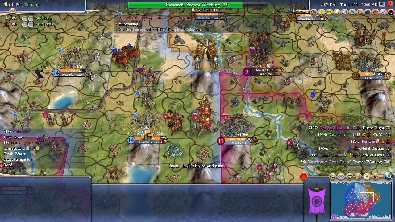 "Huh. I nearly forgot that guy was in the game. He'd been doing essentially nothing, and is behind in nearly any metric. An interesting choice of target for Pacal - the Sioux are tough defenders, but they are quite weak right now. Even better is, Qin's army is on the move! He's also bypassing Pericles - the Chinese forces entered Greek territory without declaring war! The crowd is absolutely pumped up, clearly anticipating a Chinese-Mayan coalition. If the Mayans get enough spoils from a Sioux partition they will be completely back in this game."