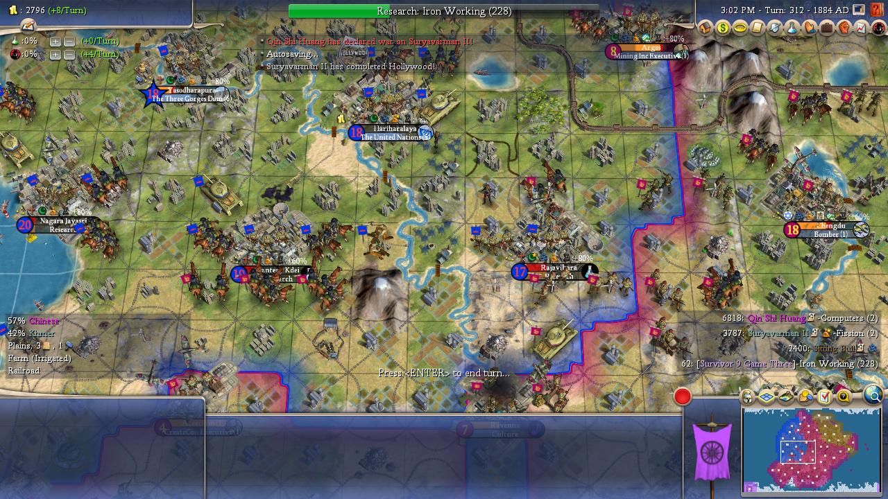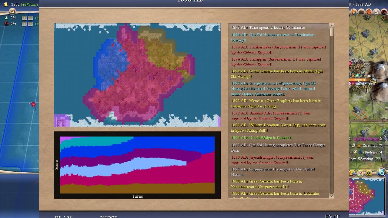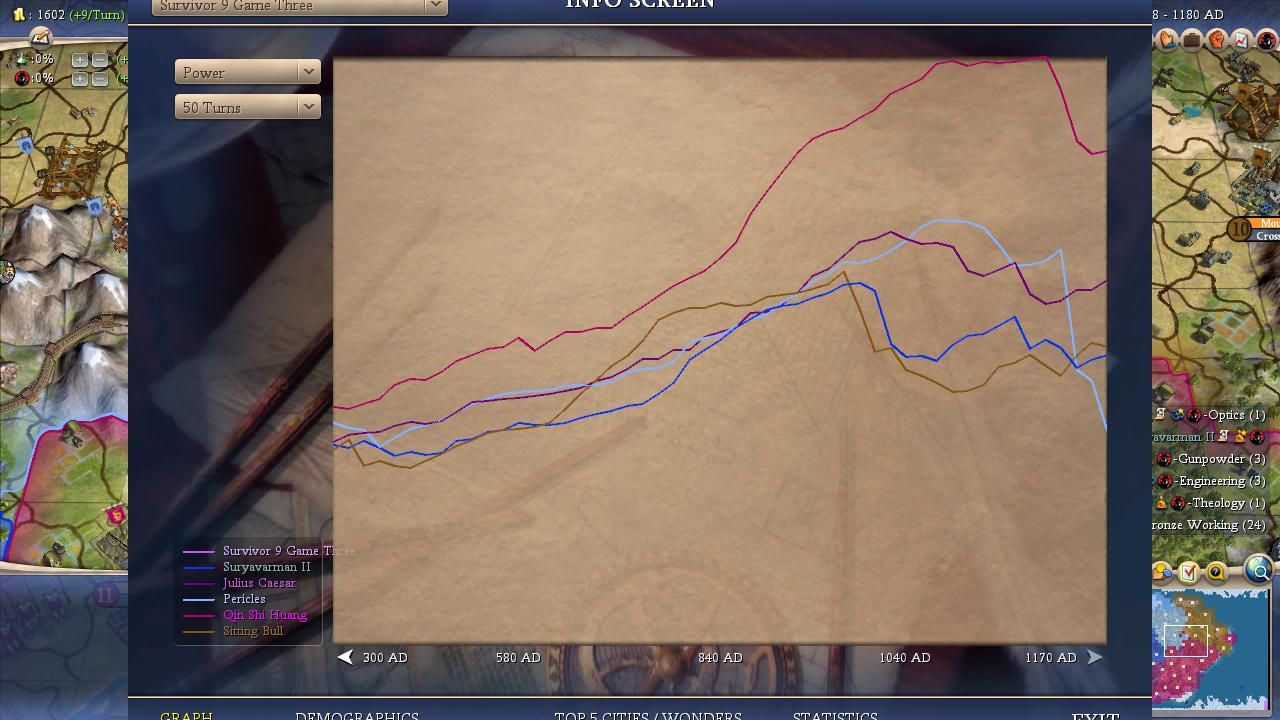 "One city falls, and Qin is already less than three percentage points away from Domination. Suryavarman is 1100 points ahead of Sitting Bull, can he hold on?"