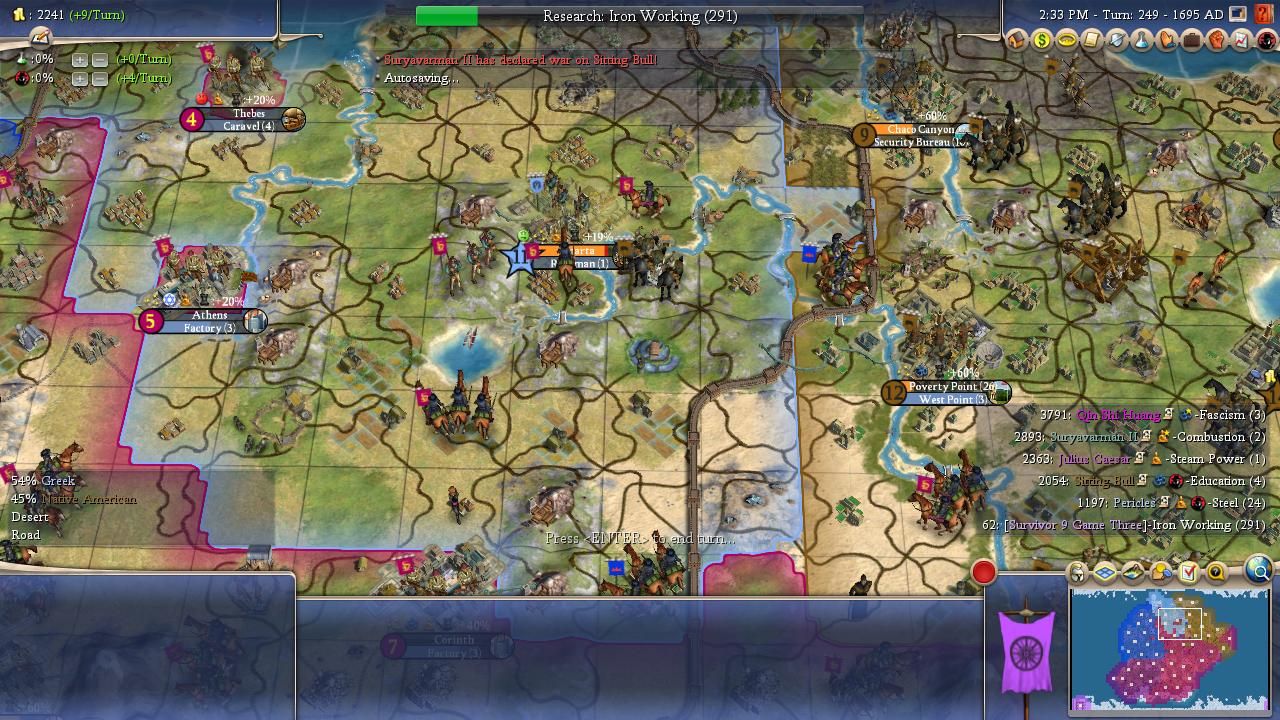 "Is Sury trying to lose this game? Qin HATES him, he shouldn't be further destroying relations by attacking his buddy. You don't want to get on the wrong side of the Chinese, not with Assembly Line and Mining Inc already giving him 14 hammers per city."