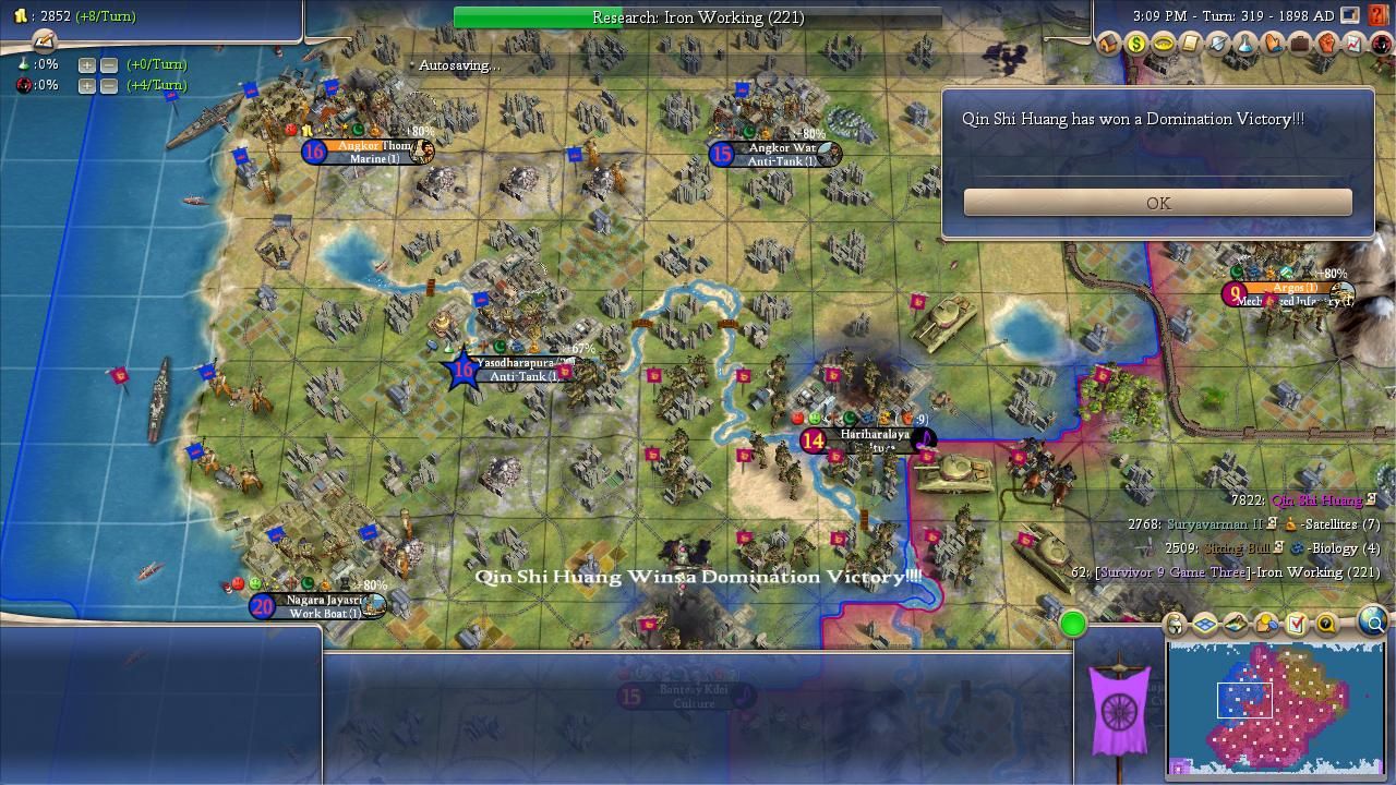 "And Qin gets his FIRST EVER AI SURVIVOR VICTORY, in stunning fashion, a Turn 319 triple kill Domination victory! The Chinese fans are ELATED, and they should be, staying up SO LATE to watch Qin - this is the first Chinese AI Survivor victory SINCE THE INAUGURAL SEASON! Greatly deserved, after a mediocre opening he just perfectly chose and executed his wars, and now has a great playoff starting position waiting for him as a reward. Sury on the other hand greatly disappointed me. He just failed greatly on the military end, took too long to research early game military techs to get set back greatly, and then spent the rest of his game either sitting on his butt or launching meaningless fights against Sitting Bull."