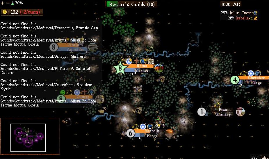 There's my civ around 1000AD. (I kept getting these sound file errors nonstop ever since entering the Classical Age. They came in a constant stream up the left side of the screen; I just ignored them and played on. Never had any sound.) I've settled most of the island at this point; I would eventually put another city up in the north, and I would have done it at this time, but I couldn't see the terrain and didn't realize there were some grasslands up there. I've just researched Currency and now my economy is about to pick up for the first time and start to research at a better rate. I soon had the research rate up to 80%, and once I started meeting other civs and got some trade going, I was able to get it to 90%, where it stayed for much of the game. I was actually contacted by the other civs first; Isabella and then Saladin sailed by and said hello. Isabella was a sourpuss and refused to trade, but Saladin and I swapped several resources and mutually benefitted. This allowed my civ to take off in growth and leave the other AI civs in the dust; they do indeed appear to fall apart halfway through the game (at least here on Noble). I built all of the world wonders from the mid-game on, and was never challenged again.