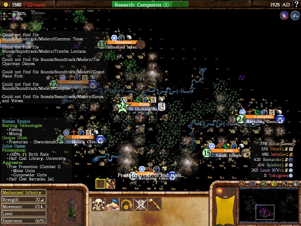 In terms of Civics, I started out using Organized Religion, then swapped to Theocracy. That was helpful for getting my cities started out, but the really strong move for me was swapping to Free Religion about midway through the game. For a civ with six religions, that gave each city as many as six (SIX!) happy faces, and then considering I could build six different temples in those cities as well... Happiness stopped being a problem for my people. The +25% boost to research didn't hurt either. Of course I could no longer see foreign cities with my state religion in them - but I couldn't SEE anything anyway, so it didn't matter! As far as the other categories, I never had enough money to justify going with Federal Reserve over Free Market's extra trade routes (and wow, in the late game some of those trade routes really brought in a ton of dough). I stuck with Serfdom throughout the game for lack of anything better; it seems weird that this is such a strong civic, dunno about that one. I ended up going with Free Speech for Legal, simply because I had few cottages and lots of specialists running in this game. Finally, I went to Hereditary Rule early on and stayed there the whole game. Roma was a behemoth, easily as strong as all my other cities combined. Why not pump it up even further? Some tweaking is definitely needed on individual civics, but the system itself is a real winner.