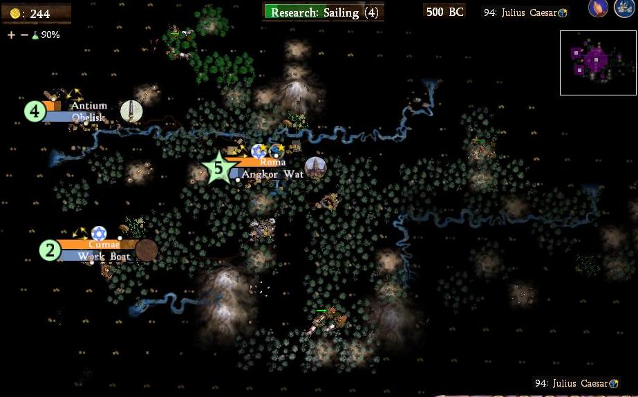 Anyway, back to the story... There was no stone resource on my island, so I skipped most of the early wonders. I also had the least clue what I was doing when first starting. By 500BC though I finally had a couple of cities and got into the wonder act. I built Ankor Wat, and used that wonder to make HEAVY use of priest specialists (and with all my temples, I could run a lot of priests). A 2 shield/1 commerce specialist is very powerful in the early game, and as a side effect, I ended up with a ton of Great Prophets. Like, my first 6 or 7 Great Persons were all prophets. I used the first 5 on shrines, then used the sixth to cut most of the research off of Divine Right, then used the seventh for the Islamic Shrine. After that, I mostly merged the Great Persons into Roma, which became my super city (but more on that later), aside from no-brainers like creating an Academy with my first Scientist, etc.