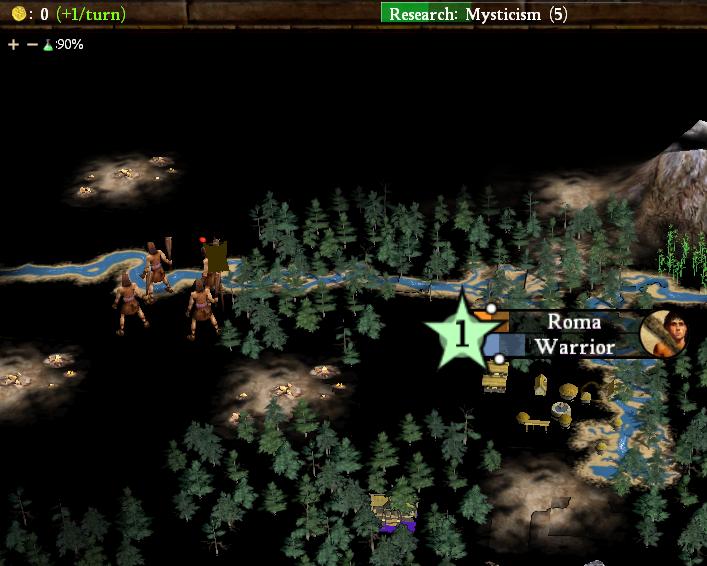 I had no clue what terrain my starting settler was on, but I moved onto the river (Civ3 habits die hard) and founded Roma on the second turn. I picked the location blindly, but the city turned out to have a great balance of high shields/food tiles, and resources galore - iron, gold, marble, horses, and corn (!) all within the immediate 21 tiles. Umm, yes... I definitely planned that. I decided to go for an early religion, so I began researching Mysticism first. My warriors in the picture above head out into the blackness.