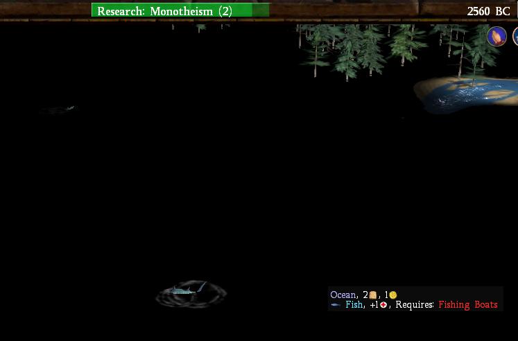 OK, so I ended up getting to Hinduism first and founded that religion. Then, since no one had founded Judaism, I researched and founded that too. I would go on to found all of the religions other than Buddhism, which Spain grabbed very early; I had no chance to get it. Still, six religions gave me a lot to play around with. I had an immense amount of trouble seeing the map, but finally I realized that I could turn on the food/shields/commerce grid and identify stuff that way. I tried to move a warrior into the ocean for about 5 minutes before I moused-over the blackness and realized it was water. The only giveaway that I was near the coast was rivers emptying into... nothingness: