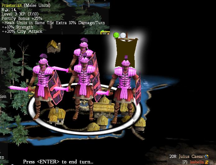 Those poor fish! What are they swimming in? OK, seriously, I soon realized I was alone on an island, which was probably just as well because I couldn't see cultural borders either. The barbs started showing up, which was interesting, but my scouting warriors prevented them from popping up in great numbers. I lost a warrior and almost had a city captured at one point, but managed to produce a chariot and kill the barb before it could wander into the unguarded city. The barbs formed one city that I captured from them (and it turned out to be a powerhouse city too). After that, I was at peace for centuries, isolated from the rest of the world. Since the oceans were a sea of blackness, I didn't have much incentive to go out exploring. I did get to use my unique unit to take the barb city; those Praetorians kick some major behind, but are they supposed to be so... pink?