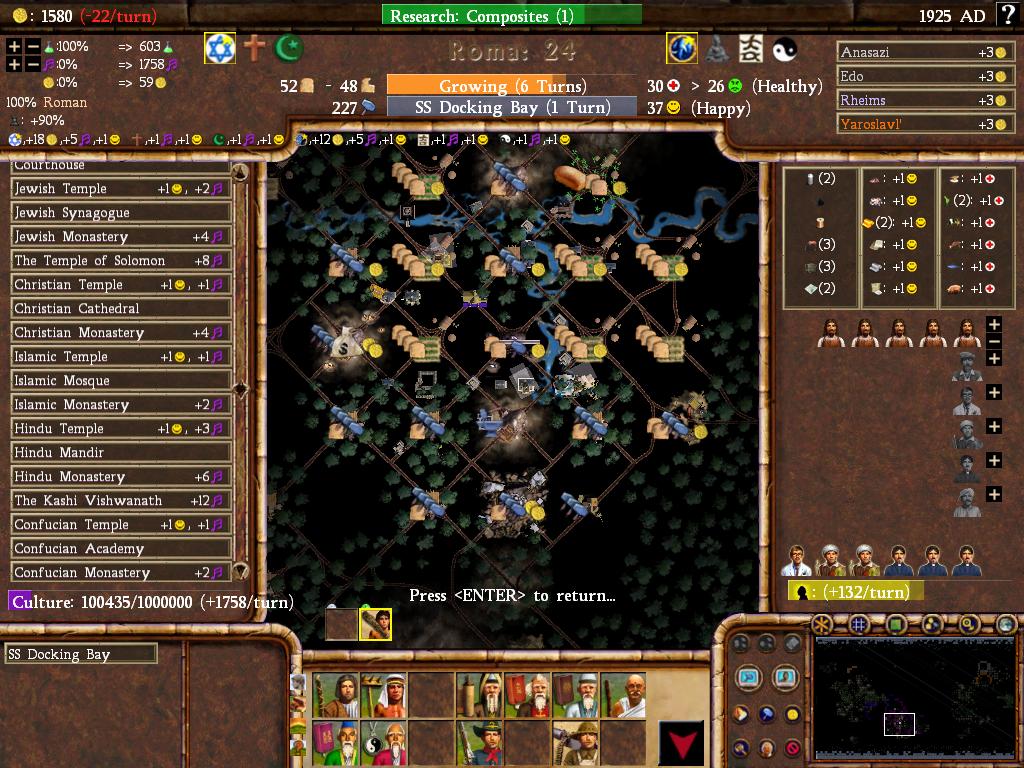 Now that's a city! Not too shabby for someone who didn't really know what he was doing, if I do say so. I wanted to see if I could get to 1000 culture/turn, then when I got to that, I tried for 1500. If I used the culture slider, I could have gotten to 2500 culture/turn easily. And with over 100 turns left before 2050AD (if that's the end date), I could probably have hit 250,000 culture in Roma. Now, what that would have DONE in concrete terms is beyond me, but I was having fun in any case. I was also entertaining myself by seeing how many shields/turn I could get Roma up to, and as you can see, I did get over 225/turn. As far as Great people, I ended up with about 20 total for the game, about 12 or so who ended up getting merged into Roma. I tried to use a Great Merchant for a trade mission, and took him all the way to Spain's capital, only to get a game crash every time I used the mission. So I carted him all the way back to Roma and merged him into the city.