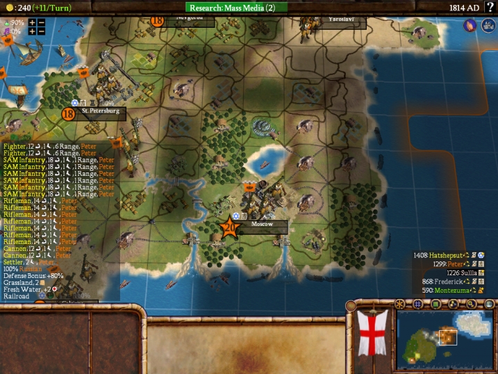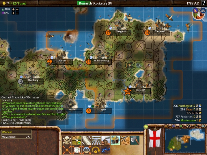 In the above shot, the lack of a religion next to the name of my civ should show that I was running Freedom of Religion, and in fact had been doing so for some time. This wiped out the minuses from having a different religion from the civs on the other continent, and I hoped that it would be enough to get the Germany/Russia civs onto my side.