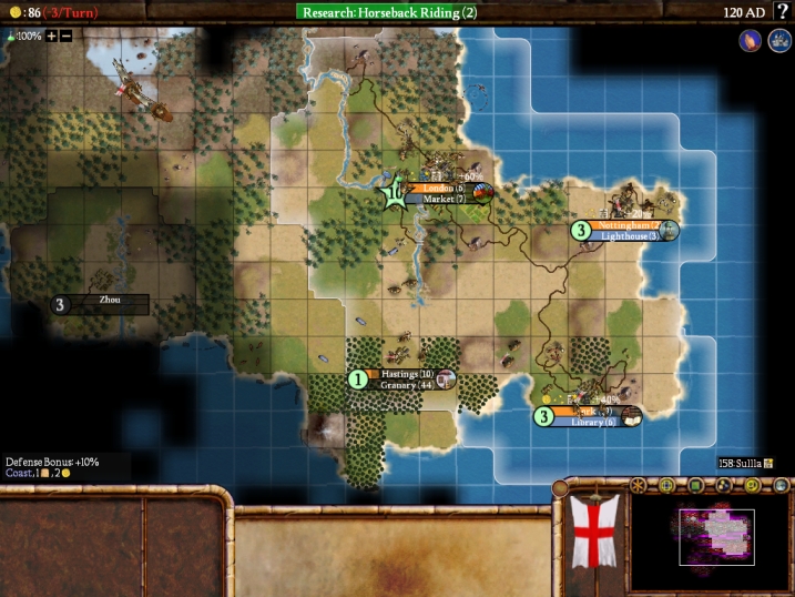 As far as this game went, when I didn't meet anyone within the first 20 turns I correctly guess that I was on an island, and a pretty fair-sized one at that. There were a fair amount of barbs running around, but I made sure to get to Archery early on and guarded all my cities with archers. My second city (York) grabbed horses, and I was able to train a couple of chariots that easily controlled the incoming barb warriors. Third city (Nottingham) went into the backline "safe" territory and was basically a glorified fishing village that could use sheep and two plains hill tiles for production. Fourth city (Hastings) was a dotmap filler that had decent but not great land. I expanded slowly, knowing there was no competiton for land, keeping my science rate up at 90% or higher the whole time. London built the Oracle sometime in the BC years and grabbed Code of Laws with it, founding Confucianism in York. Since that religion again spread to my third city before Hinduism, I again swapped over to the newer religion (second game in a row the exact same thing happened). Here was the situation in 120AD: