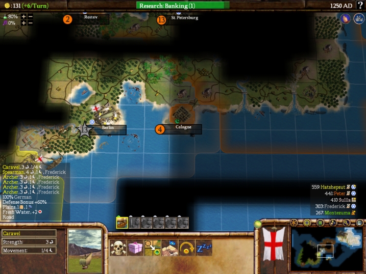 Here's a shot of one thing that still appears problematic. Frederick definitely has Feudalism, yet his defense in his capital city is still made up of archers and not longbows? The AI civs are just not upgrading their units well enough. If they need to turn down their science for a turn or two just for upgrades, they need to DO IT in order to provide some real defense. All these archers are doing is costing Germany money in unit costs. At the very least, if the AI finds itself in a war it needs to stop whatever it's researching and upgrade those units. Right now it seems like a human could exploit this.