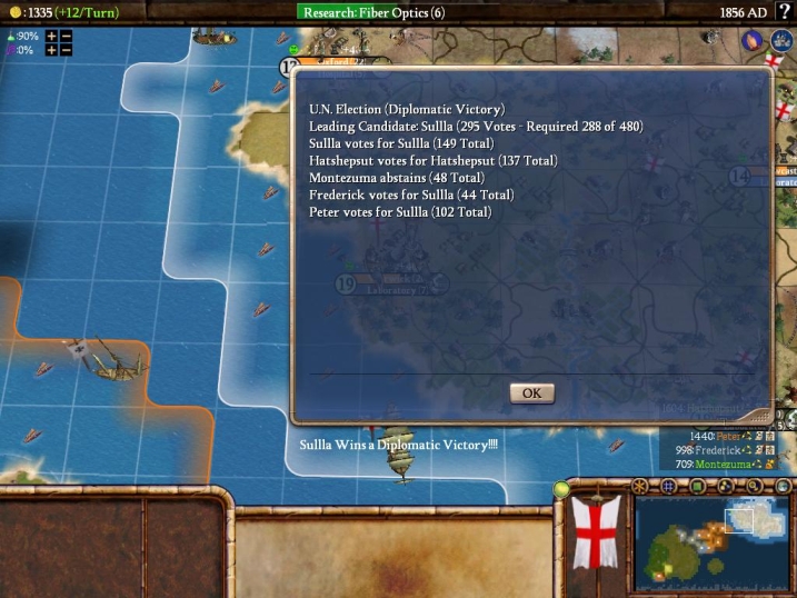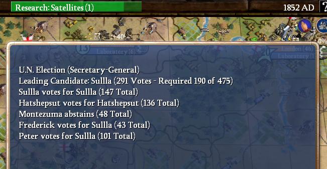 Anyway, I built the UN in 1850 in London (it still took 15 turns with Factory/Coal Plant/Iron Works, heh). The election for Secretary-General came up a couple turns later, me versus Hatshepsut (no surprise there). So had my diplomatic work paid off?
