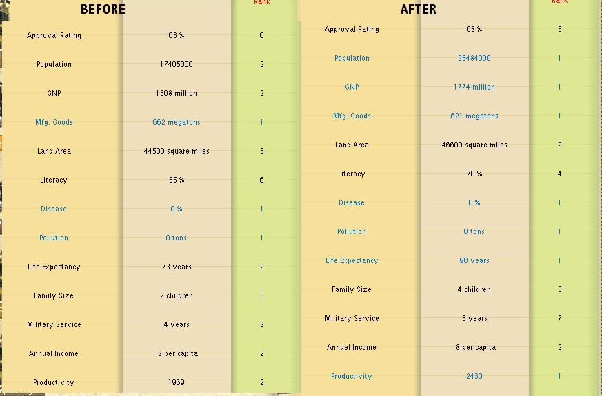 I'm leading in land area and have more population than anyone other than Egypt's insanely irrigated floodplains civ. From the demographics of the same year, I can also report than I am #1 in GNP (361 to 213), #1 in Manufacturing (167 to 75), and #1 in crops (263 to 154). In short, I'm basically dominating in all categories. But my score is behind not only Hatshepsut, but behind Peter's tiny civ as well?! What's going on here?