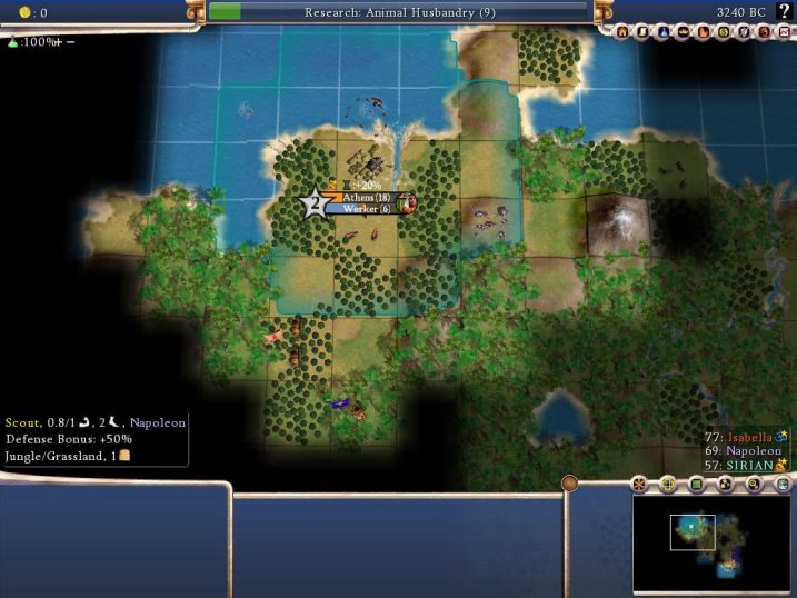Makes for an interesting game, no doubt, but not one I was eager to play around with when surrounded by aggressive AI civs. Met Napoleon, Isabella, and Caesar all quite early - a rather aggressive bunch, only Caesar being a somewhat peaceful guy. What's worse, Napoleon blocked the only possible direction for expansion (east) so the odds of playing the game peacefully were just about nil. By 1500BC, I had already realized I could not win the game just through peaceful development. There's not enough land to do so, and everything close to me was solid jungle anyway. Therefore, at some point in time I'm going to need more land, and Napoleon is the best person to get it from.
