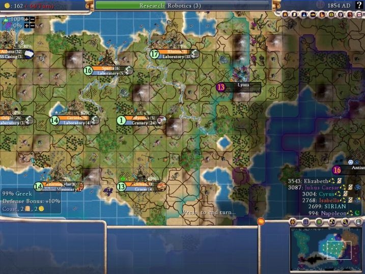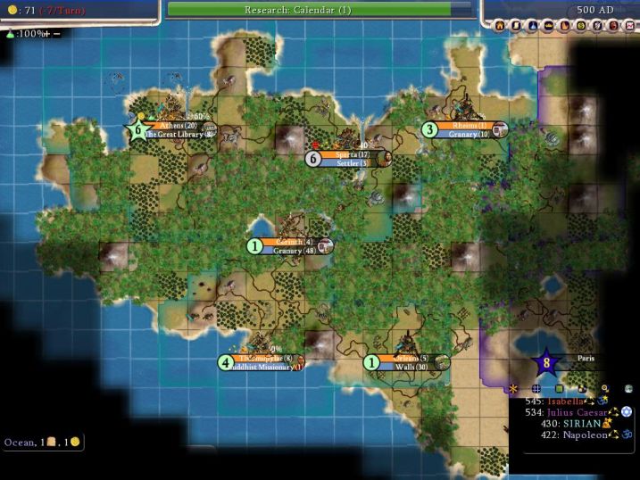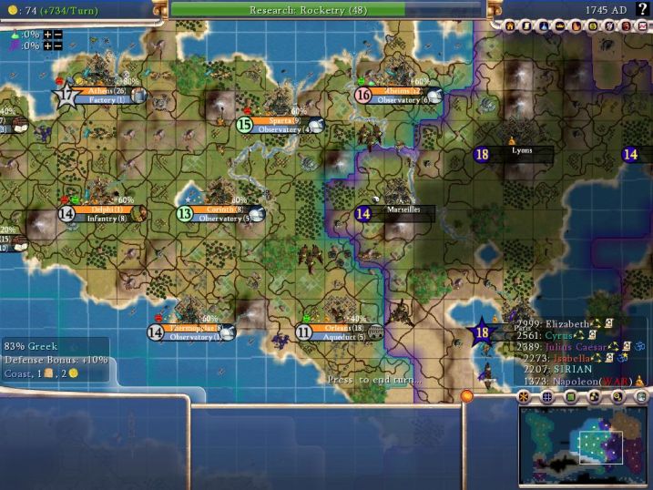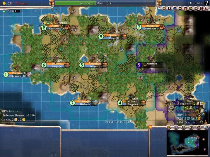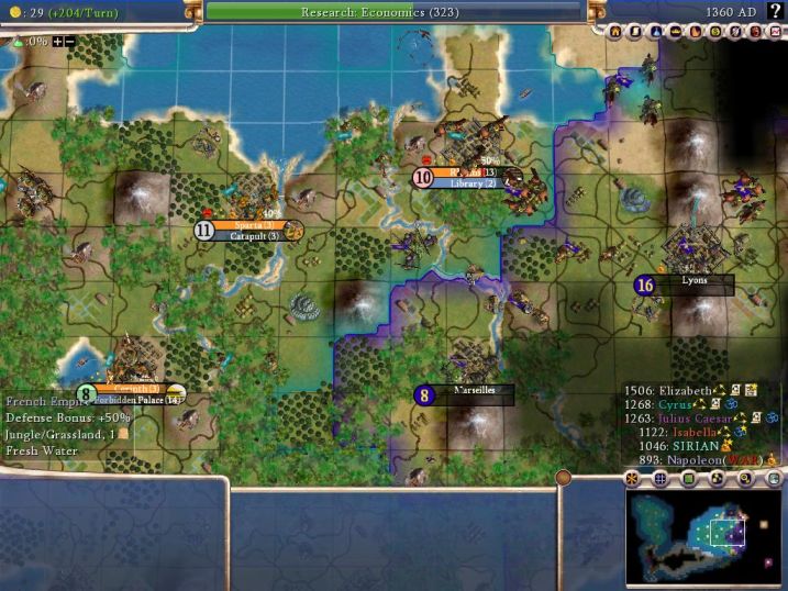 This map looks a lot better than a couple of centuries earlier. I still have two more cities to place, one on the plains tile west of Athens on the coast and another on an unclaimed island north of Athens to grab the crabs up there. The only bad news is that Nappy has stuck the city of Marseilles in between Rheims and Orleans. That city would eventually expand its borders and take away the gems at Orleans! *sigh*