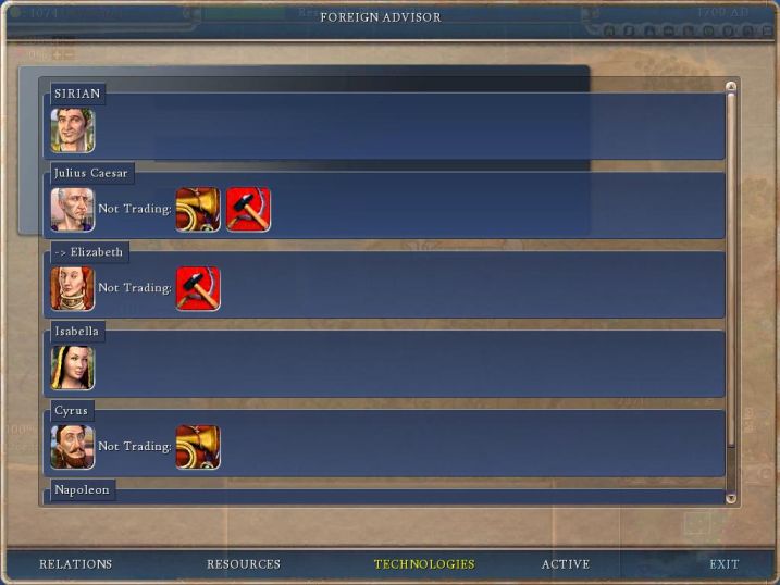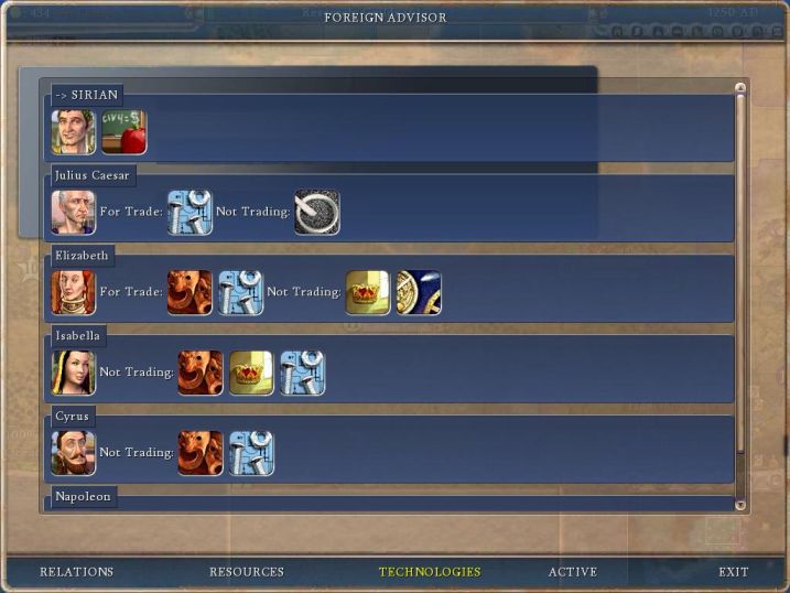 A quick thumbs-up for everyone working on the new interface. This tech screen on the Foreign Advisor panel is just outstanding. It clearly displays in easy-to-read icons what techs you have, what the AI has, and whether or not they would be willing to trade. Fantastic stuff. Don't go changing this around at all.