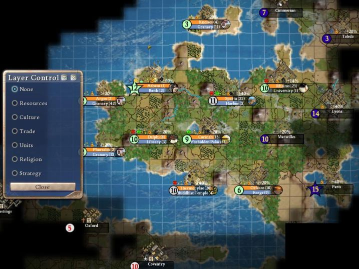 One other thing I should mention. Opening up the F4 screen sometimes caused a crash; I got this multiple times at different points of the game. Probably caused by the multiple leaderheads on the "Relations" screen crashing my computer's memory, but still very inconvenient. Oh, and the leaderhead animations were a HUGE drain on my computer's performance all throughout this game. Every time I would talk to one of the leaders, the game would SLOOOOOWWWWW DOOOOWWWWNNNNN. I'm not running the greatest computer in the world here (this one is 3 years old), but it was less than optimal.