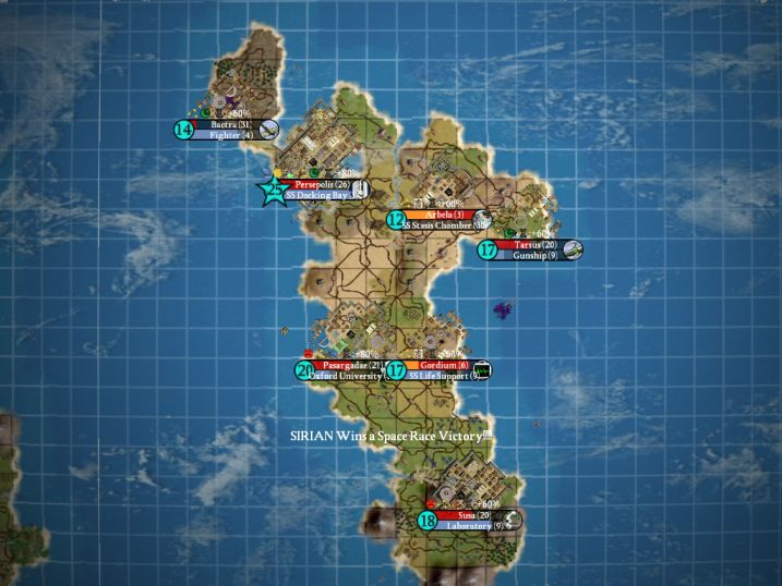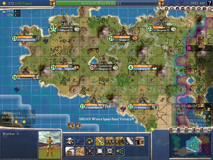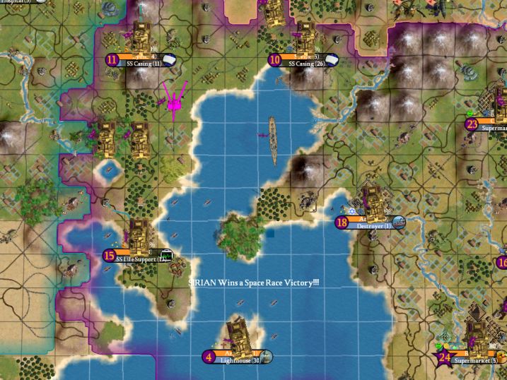 Lacking copper certainly didn't help in my efforts to build the spaceship. I caught a MAJOR break in 1886 when Athens generated a Great Engineer; with all its wonders, it had about a 20% chance to get any of the 5 types, so this was a great stroke of luck. My smaller cities concentrated on the SS Casings and Thrusters while Athens built the individual parts (for this reason, I had to stay in Bureaucracy even though Universal Suffrage would have helped out my research). Yes, in the end it was production of the parts and not researching the techs that would prove to be critical in the space race. I like this, since you can't win the game solely by having a lot of commerce. You need to have decent production as well; this makes the spaceship victory a little more balanced (IMO).