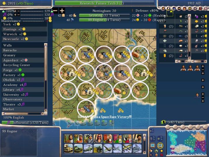 Nottingham is an impressive city, no doubt (and Lizzie almost has Future Tech 3!) but it's only getting 40 shields? At first I thought, "the AI is building this in the wrong city", but Nottingham actually had more production than pretty much any of the other AI cities. From what I saw here, the AI is failing to improve its production base using factories and power plants. That's part of the reason why spaceship production is lagging; the AI isn't increasing its production enough. Here on the final turn of the game, 1912, London was still building a factory. LONDON! It still didn't have one! These problems get hidden by the AI's large cost discounts on the higher difficulties, but it's still there, and it's a problem. Not to mention the fact that the AI civs build TOO MANY COTTAGES - they research great, no doubt, but when it comes to building the spaceship? Not so good. Lizzie is running Universal Suffrage and getting extra production from those towns, as she should, but it's still not enough shields.