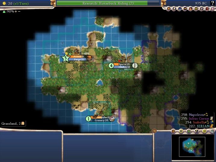Researching Horseback Riding, Athens is building its forge. Sparta was the ONLY genuinely good site around the capital, with cows and rice. Still a lot of jungle stunting its growth though... Thermo was the only decent spot I could find in the south, with spices and (after border expansion) cows. Also note the crippling happiness penalty you get from playing on Emperor; Sparta is only size 4, and it's already unhappy! I waited forever for my religion to spread there, then finally gave up and just built the obelisk you see there. Bah.