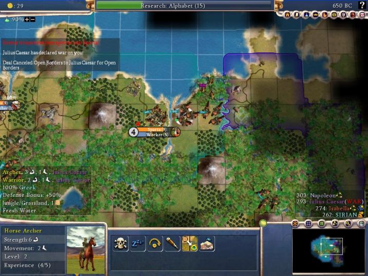 Now since I had a bunch of Horse Archers on hand with which to attack Nappy, I easily slaughtered this invasion. But I was left scratching my head over why he had declared war in the first place, Caesar being on the opposite side of the continent from me. This is the first war declaration I've seen in Civ4 that literally made NO sense whatsoever. It felt like a "dice roll" war declaration, and that's not good. I've got a 500BC savegame that I'll post (along with some other ones) so that maybe Soren can figure out what's going on. Very bizarre incident.