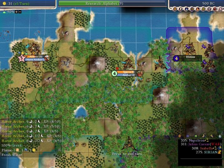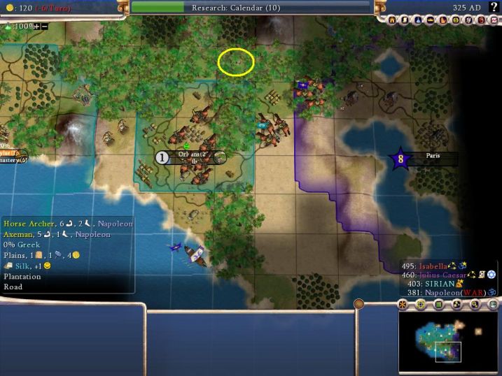 There's the key city flying the Greek flag; I've circled the critical gems resource in yellow to identify it better. Napoleon continued to send mostly Horse Archers after me, which I was able to take care of without much of a problem with my own Horse Archers. Now what Nappy SHOULD HAVE DONE was send some spears at me; he did have copper and easily could have done so. I would have been unable to cope with that, lacking metals myself, but he never figured it out. Thus when I got peace in 425AD, I was the clear victor, having taken Orleans at virtually no cost whatsoever. The AI generally does a good job of building combined arms, but it over-builds horse units when it has that resource. And of course it's easy to take out any unit if the AI builds it exclusively. I'm pretty sure that Soren is already aware of this problem with the AI loving horses too much, but I wanted to re-emphasize it here. Also notice that the unit flags have disappeared from some of the units in the above picture; the units one tile south of Orleans are Napoleon's but it's impossible to tell any way other than by mouse-over. Lost a worker due to this, gak! Hopefully will be fixed in v.76.