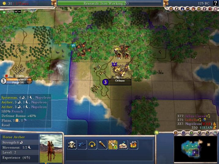 Now the whole point of the war was to capture two cities from France - Rheims and Orleans. I captured Rheims easily, but since I was taking some signicant losses to my Horse Archers, I wasn't able to get down to Orleans as soon as I would have liked. But by 125BC I finally had 5 Horse Archers in position to strike against the 2-3 archers I knew would be in the city (big advantage for me). But what do I find in the city when I arrive next to it? Nappy's got a SPEAR in there! Argh!