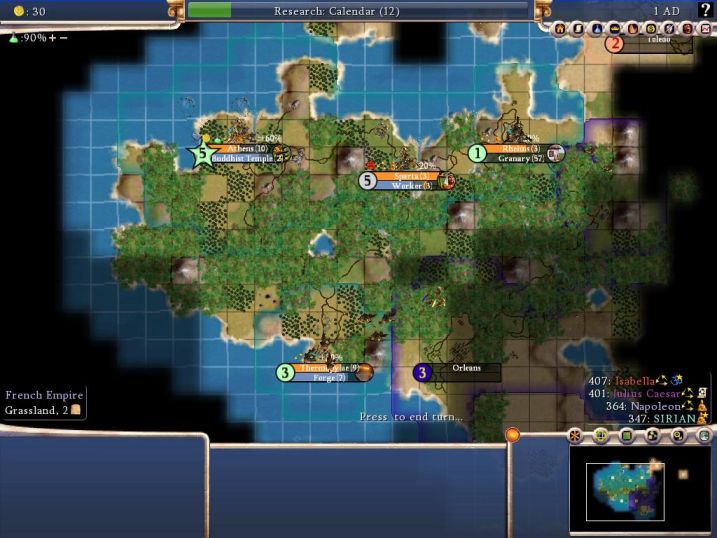 Furthermore, one thing I became convinced of while playing this game is that Orleans was the key to success on this map. The location that Nappy picked for the city had incense, TWO spices, bananas, and (most importantly) a gems resource. That gems resource meant +2 happy faces in all cities (with forge), so combined with the incense the city of Orleans meant 3 happy faces. That's a LOT! I already had spices at Thermo, but additional ones would allow me to trade them for further resources. So the spot was absolutely critical; I believe that capturing Orleans would be the key to success on this map (among many other things, of course). I failed to take it here - but I expected to be back at some point.