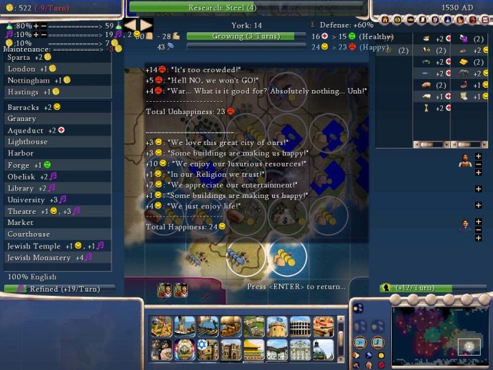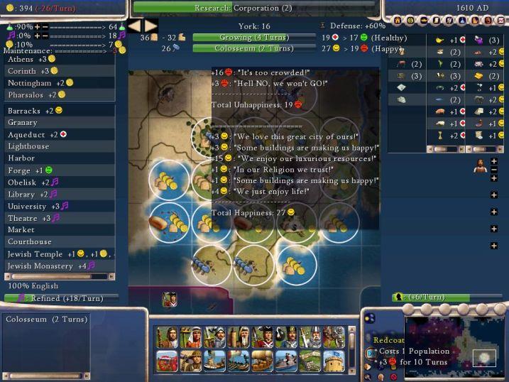 Bye, Greece kicks the bucket. That didn't take too long, did it? York was initially drafted in 1410, then again in 1505 which was 10 turns later. The Greek war is OVER so there's no war weariness anymore to factor into the happiness equasion. Take a look at it though: