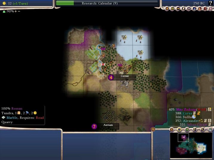 My scout found this while wandering. Uh, there are no roads on any of those fur tiles or on the quarry, thus Rome doesn't have access to them. Soren, do you have any clue what's going on here? I've got a save file for you if you're interested.