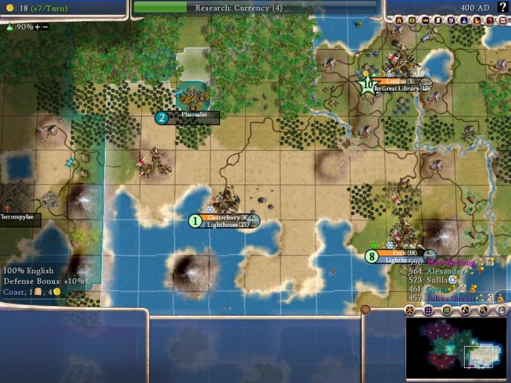 Some interesting points emerge right away from drafting. First of all, the size of the city is totally unimportant for the draft, as the units magically appear from anywhere. If anything, smaller cities are better because they can grow back the pop point faster and are more likely to have excess happiness. In particular, fishing villages with few or no shields rock for drafting (Canterbury was the model for that in this game; 1 shield/turn but it could still draft). This is an intereseting alternative to Vassalage, which increases the XP of all units produced and so generally benefits larger cities the most. Nationhood's draft is socialistic in nature; all cities draft equally, so it would be the stronger move for a civ with lots of small cities.